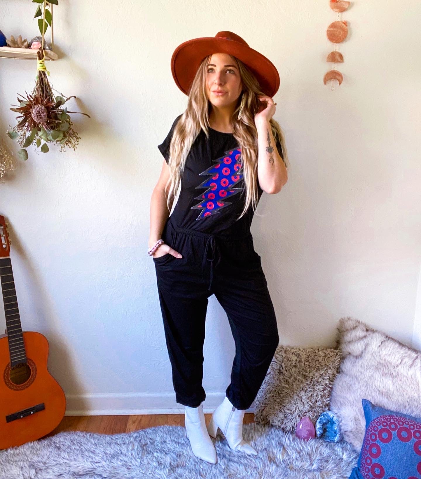Black comfy jumpsuit feat. pockets and an elastic waist. Phishy donuts in a 13 point bolt appliqué.. cause why choose just one? ⚡️⭕️