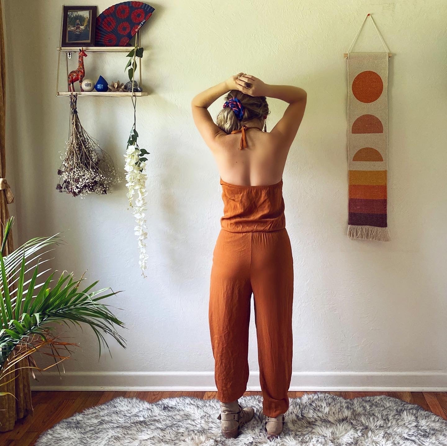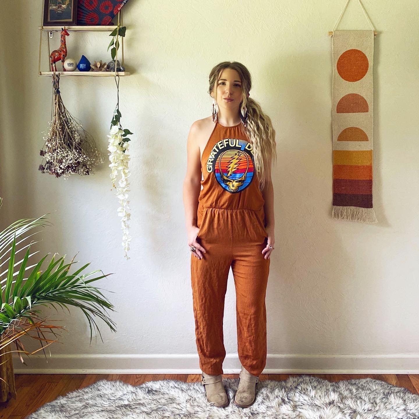 Lightweight rust colored jumpsuit with GD appliqué.